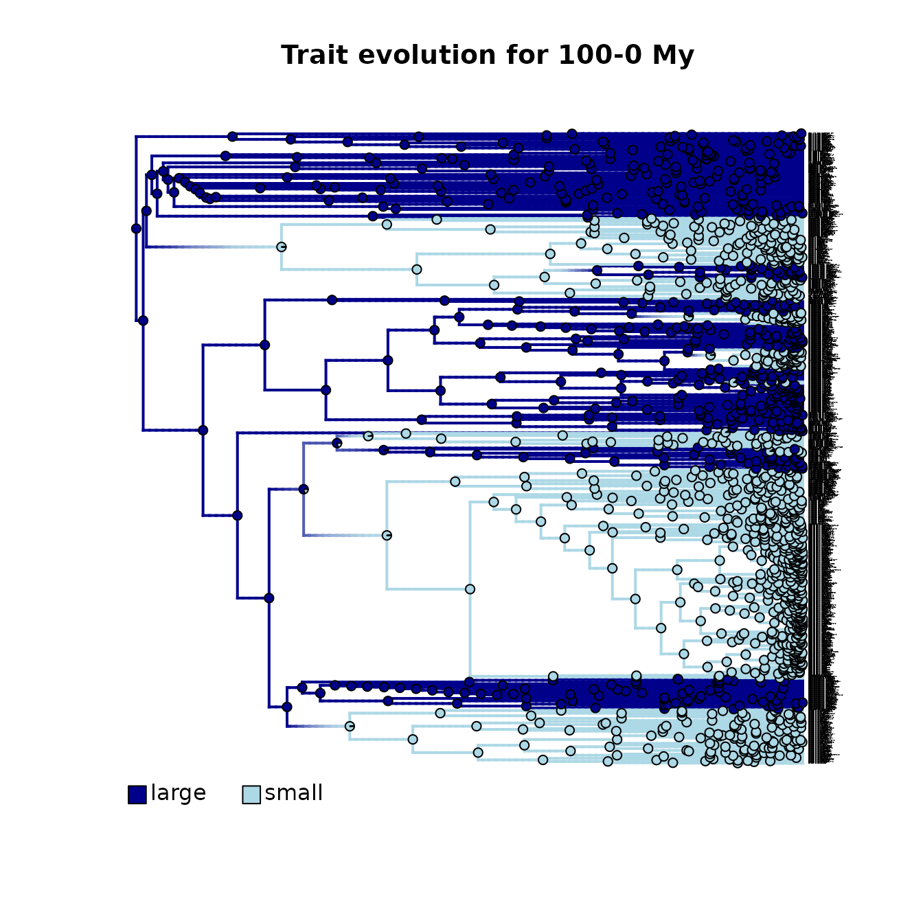 ## The next plot shows the evolution of trait data across the whole phylogeny (100-0 My).