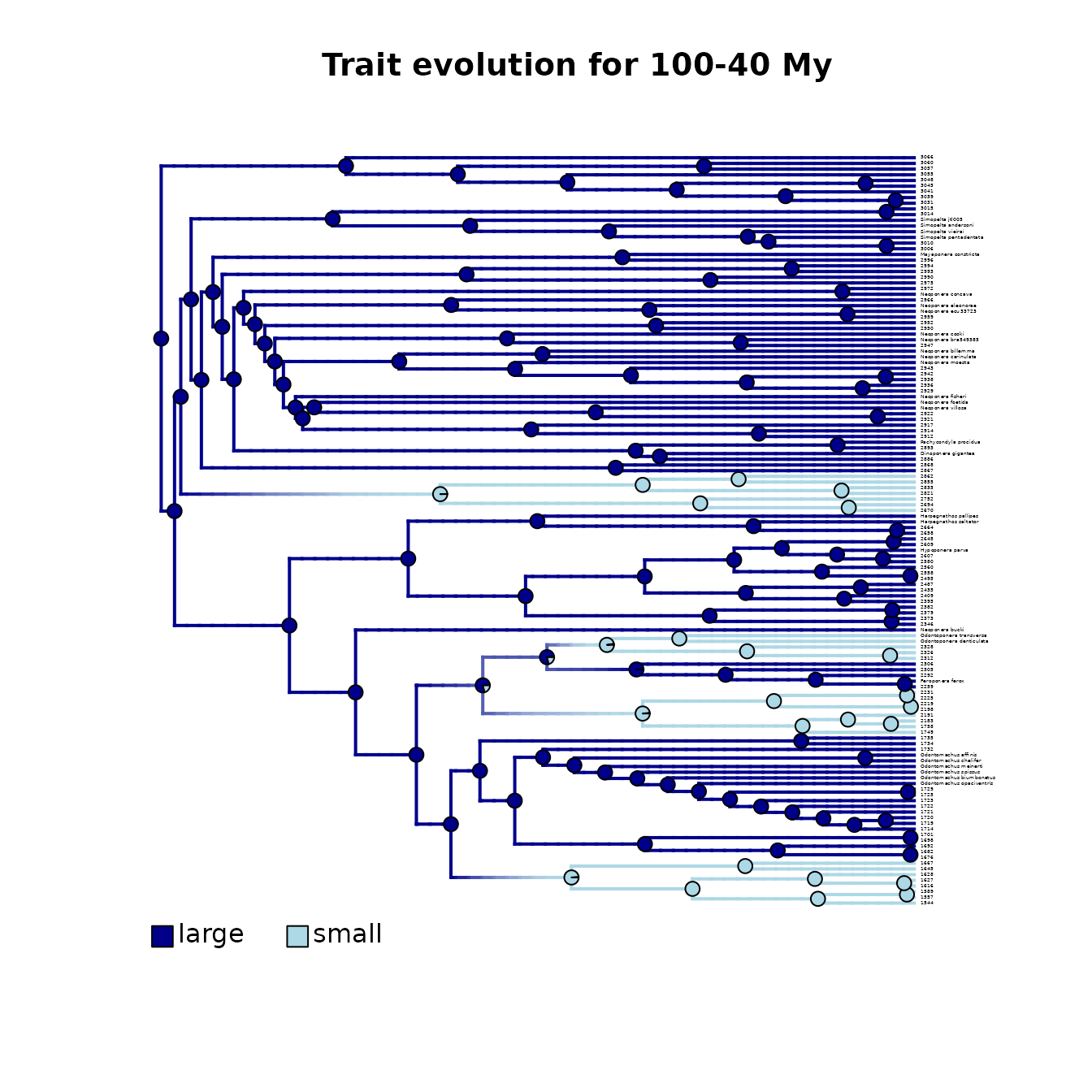 ## The next plot shows the evolution of trait data from root to 40 Mya (100-40 My).