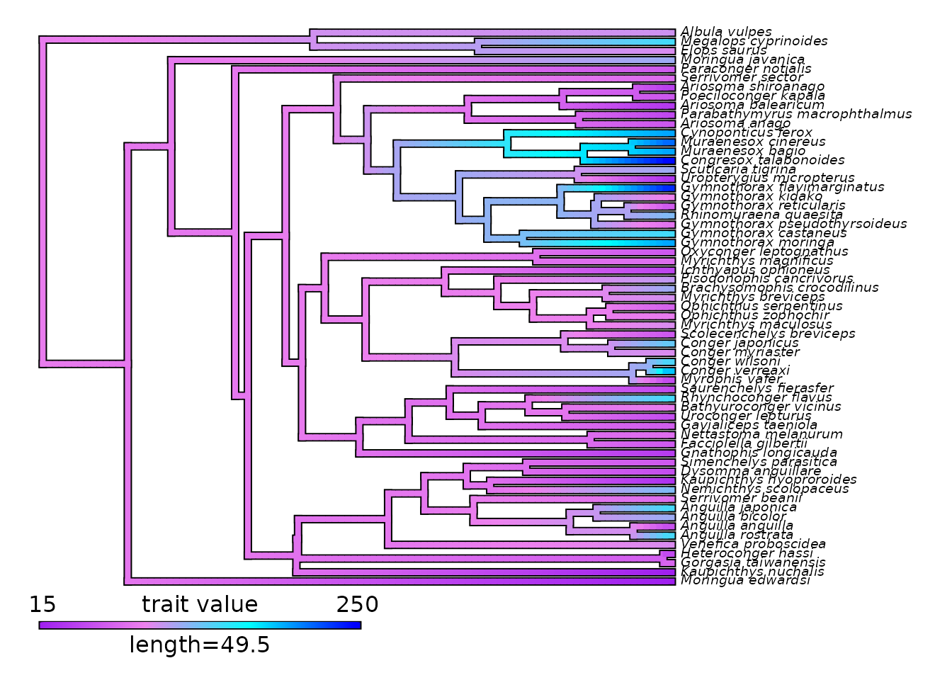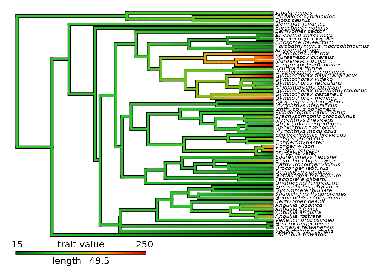 res = 100, # To set the reoslution of the continuous mapping of trait value on the contMap