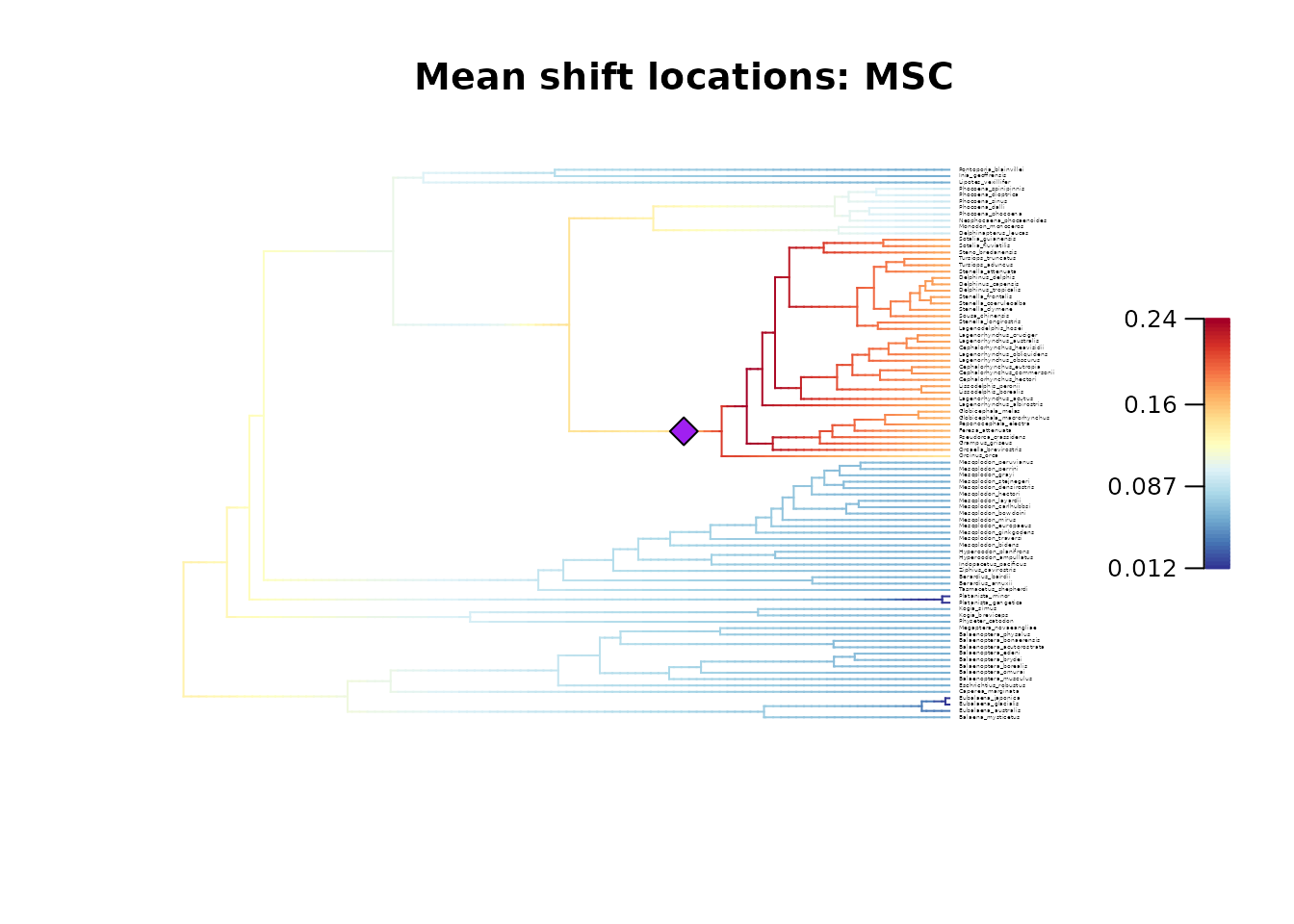 # time-varying diversification rates and regime shift locations.