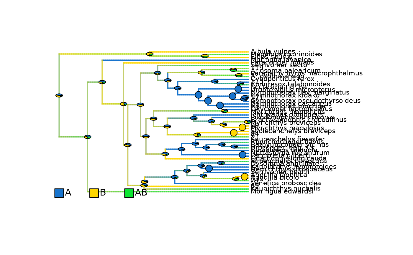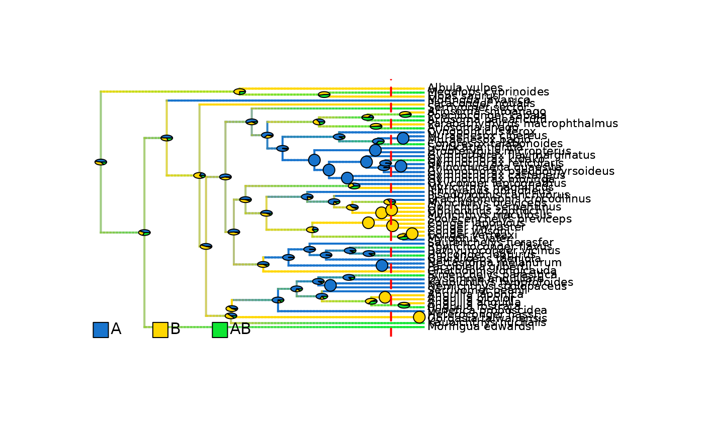 #> WARNING: No ancestral character estimates (ace) for internal nodes have been provided. Using most likely ranges extracted from the densityMaps instead.