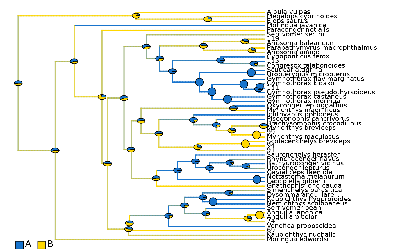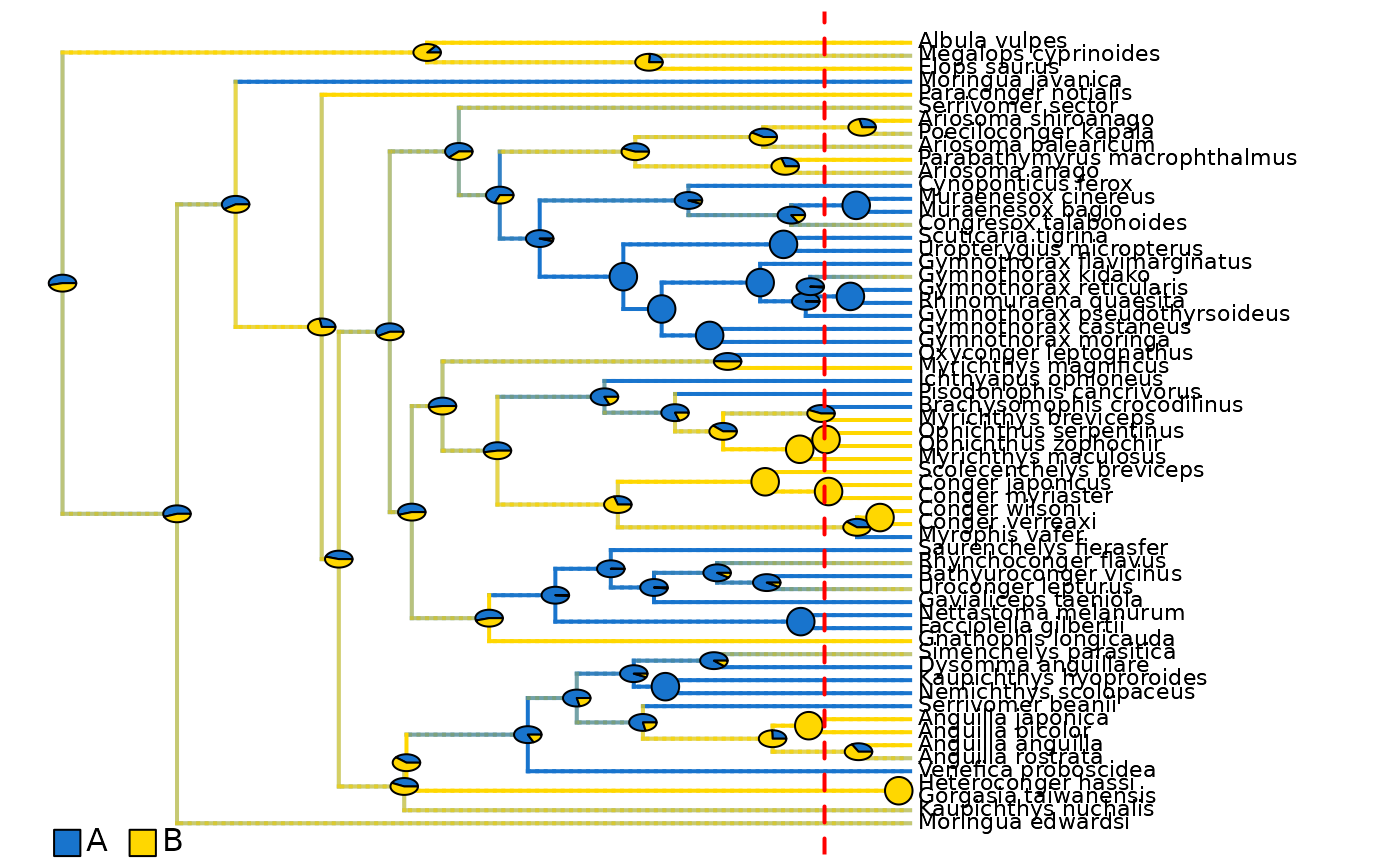 #> WARNING: No ancestral character estimates (ace) for internal nodes have been provided. Using most likely ranges extracted from the densityMaps instead.