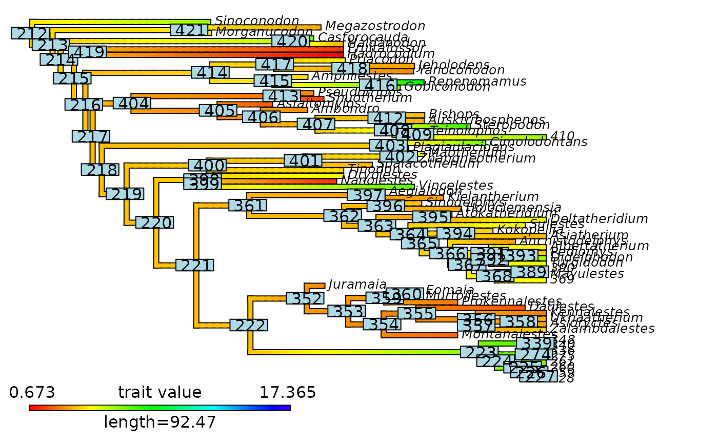 mammals_contMap <- phytools::contMap(mammals_tree, x = mammals_data,